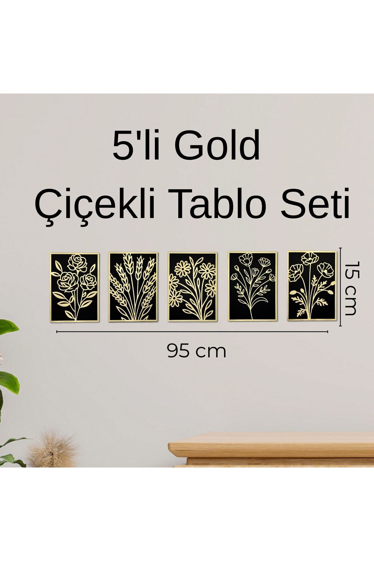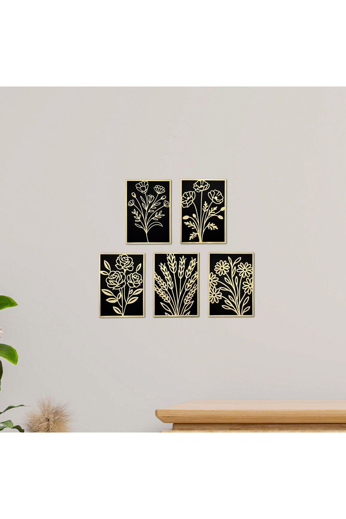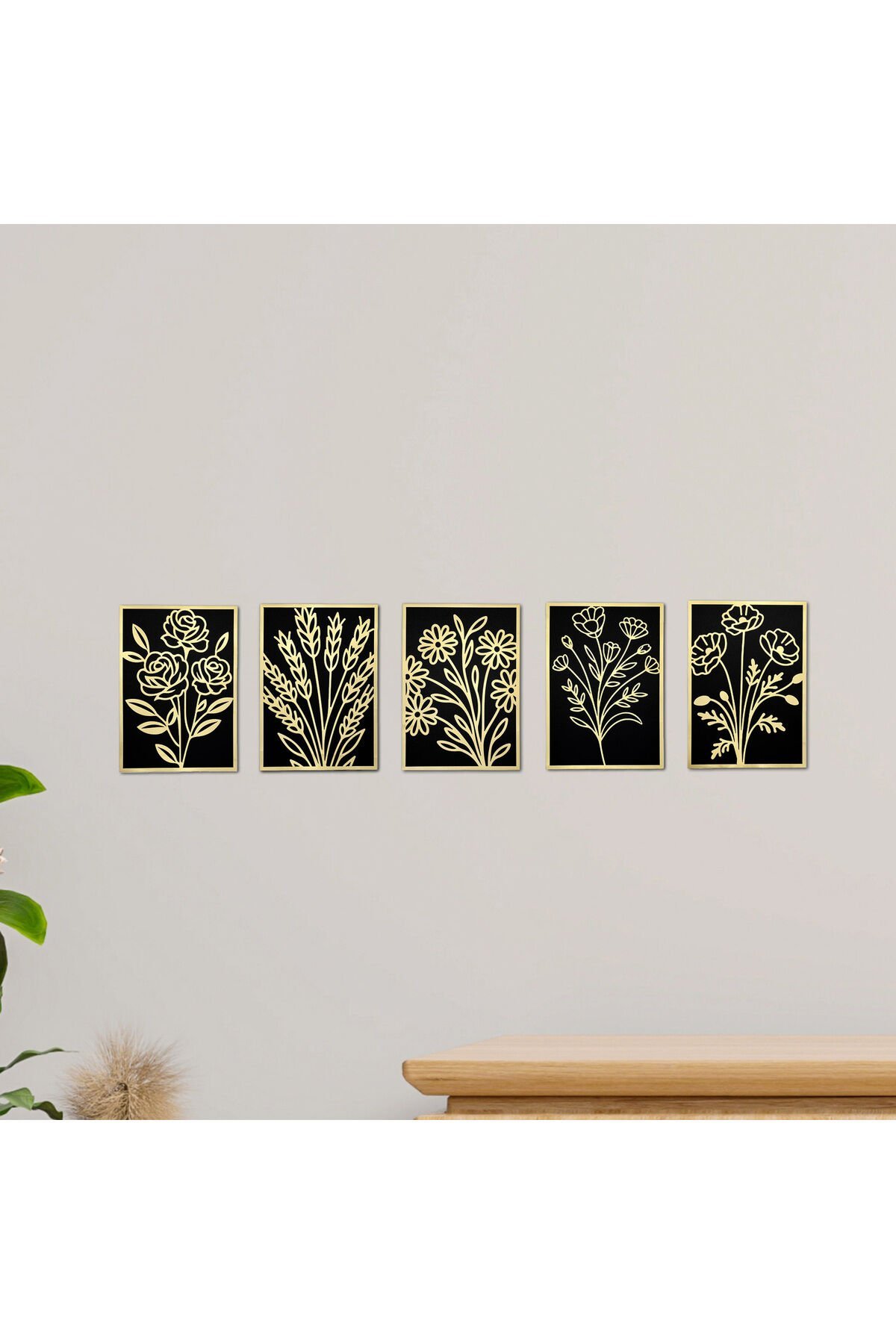 5’li Gold Pleksi Harfli Siyah Ahşap Çiçekli Dekoratif Tablo Seti - Modern Duvar Süsü