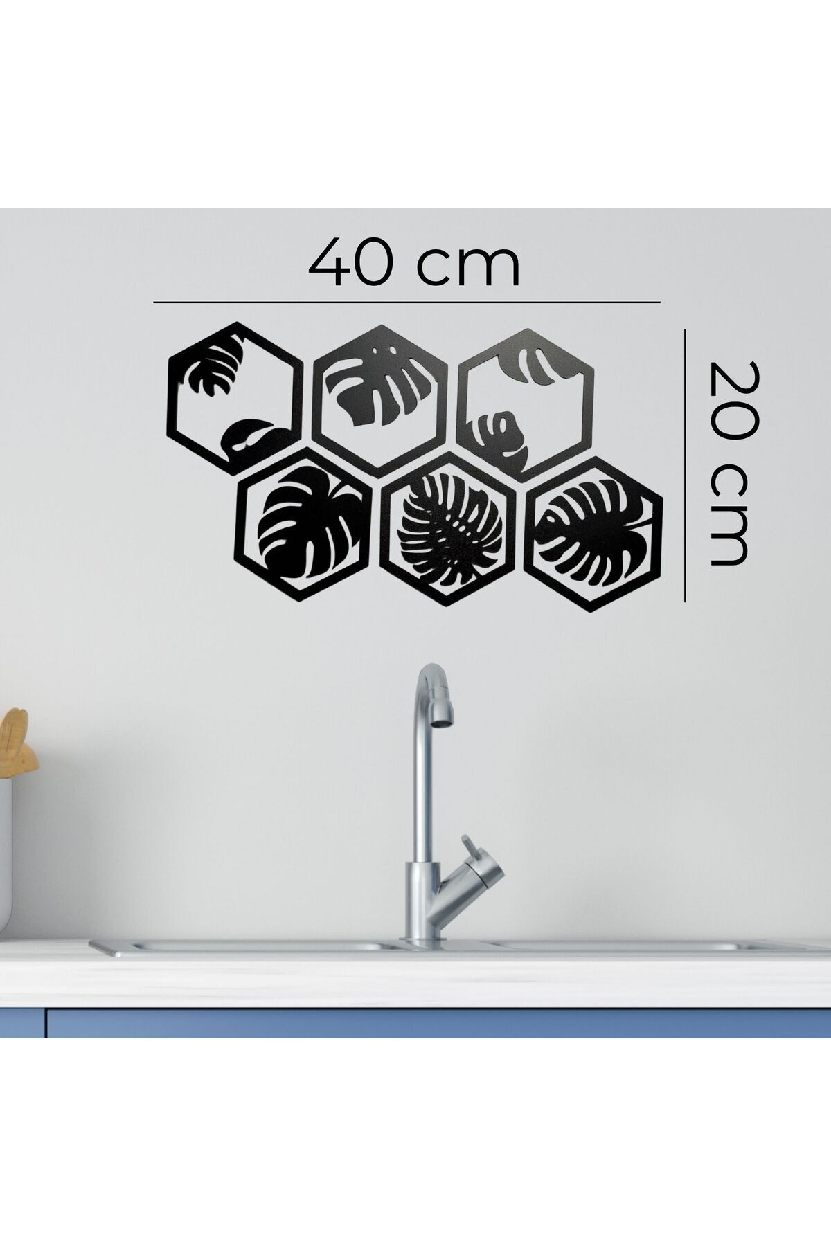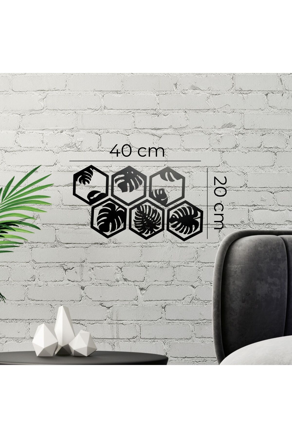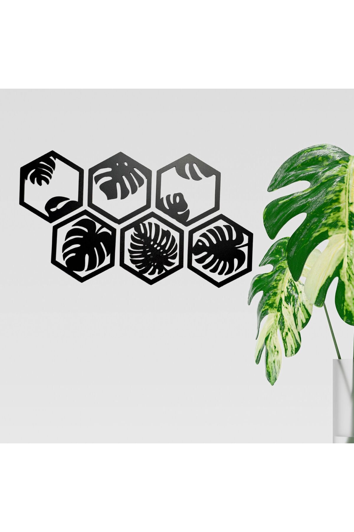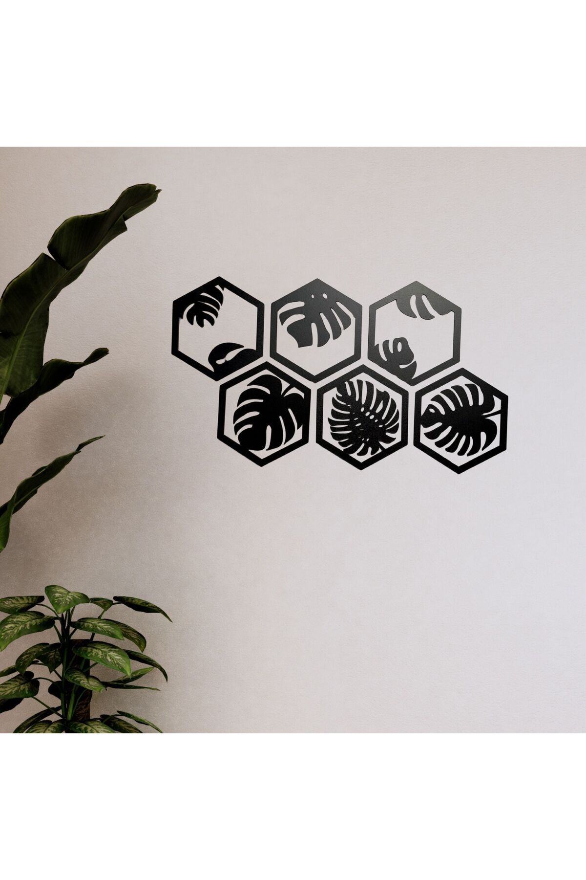6 Parça Siyah Ahşap Deve Tabanı Bitkisi Desenli Altıgen Duvar Süsü - Modern Dekorasyon, 40x20 cm''