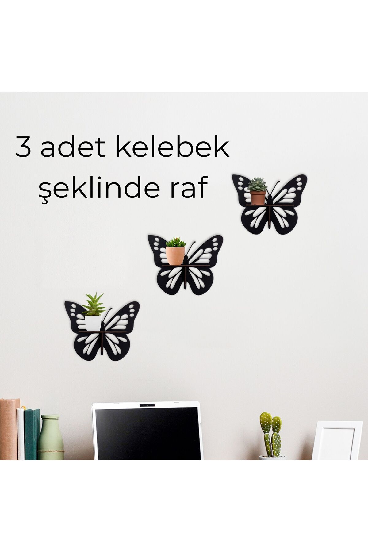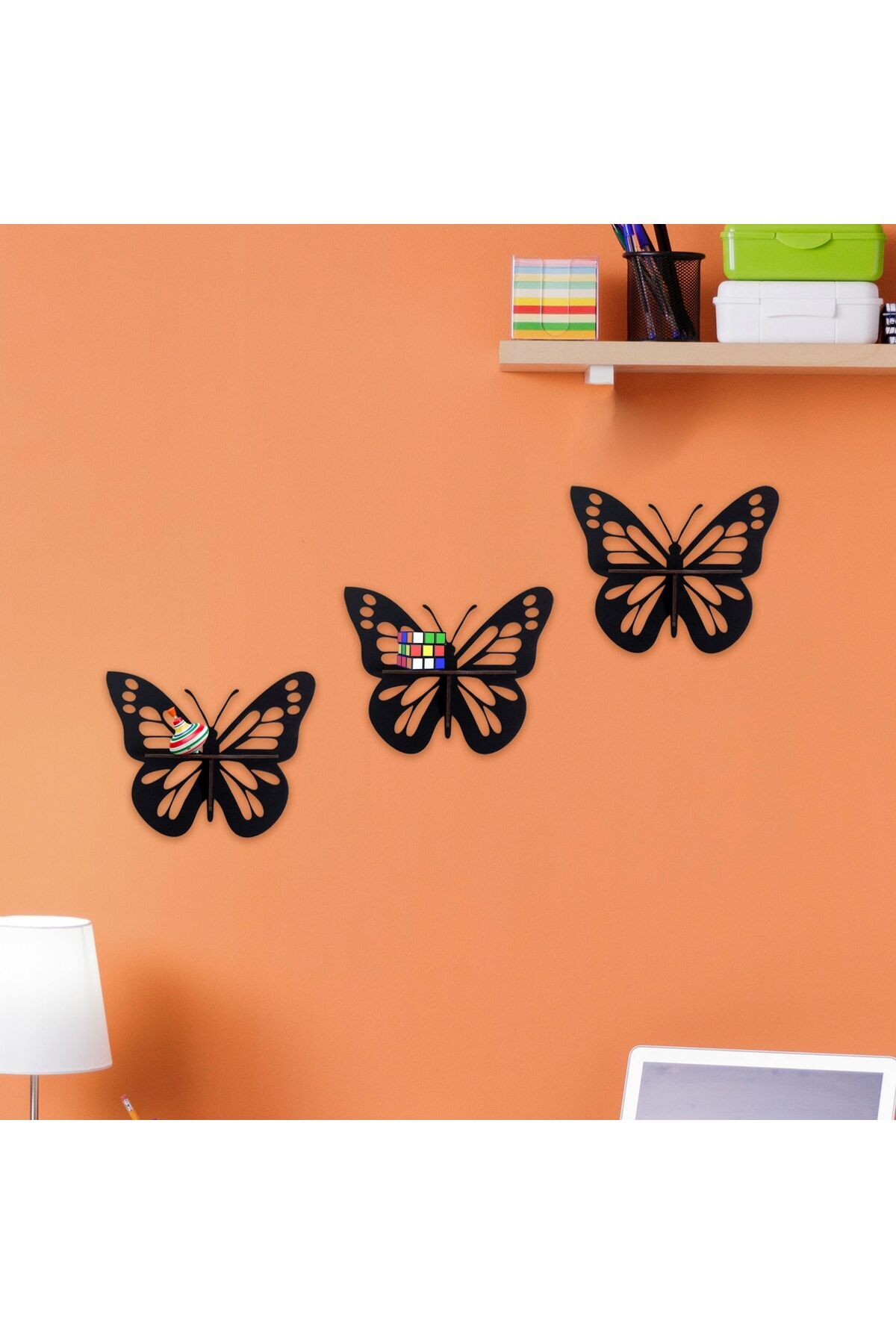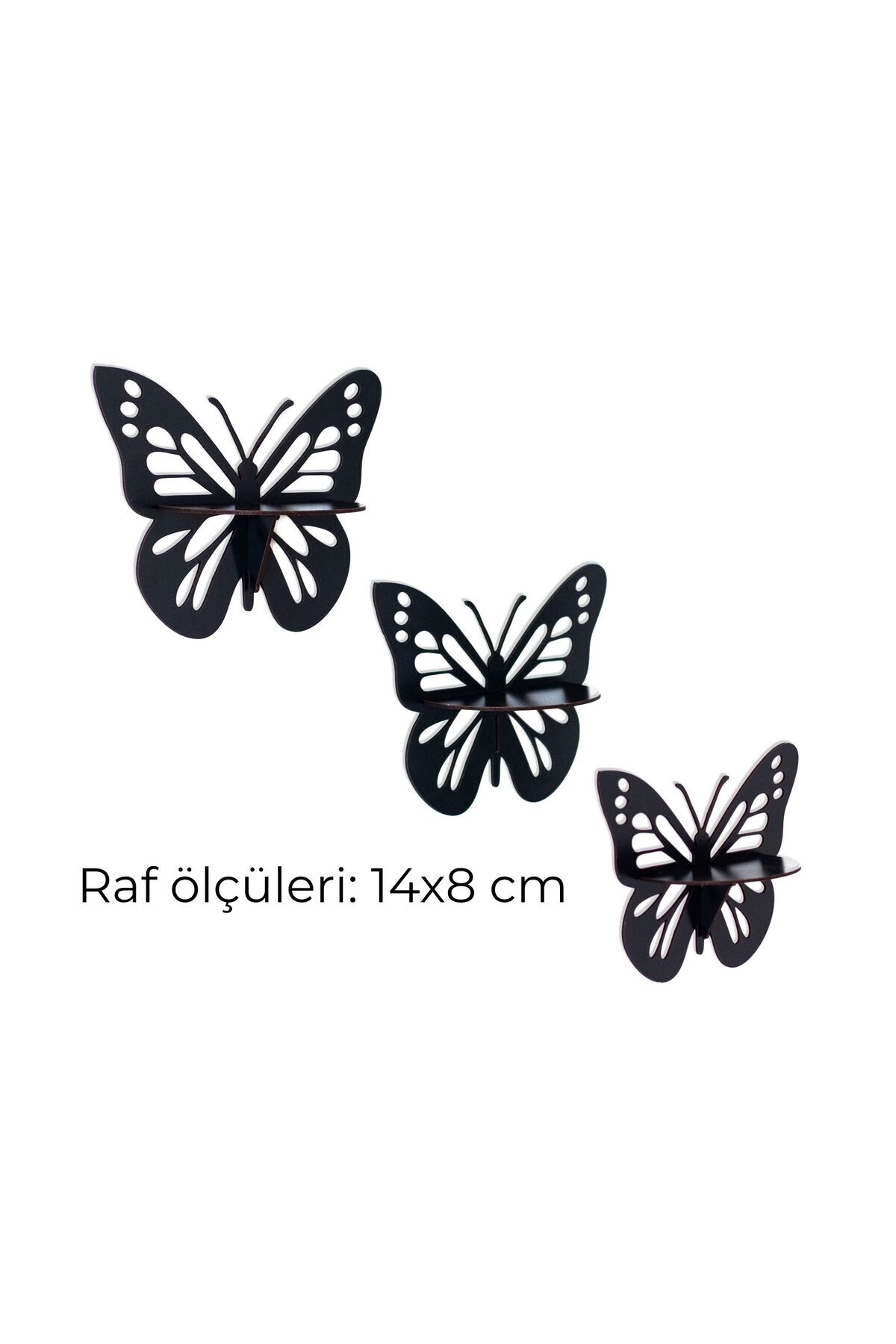 Dekoratif Kelebek Duvar Rafı Seti | 3 Parça Ahşap MDF Raf | Siyah Renk | 14x8 cm Mini Raf
