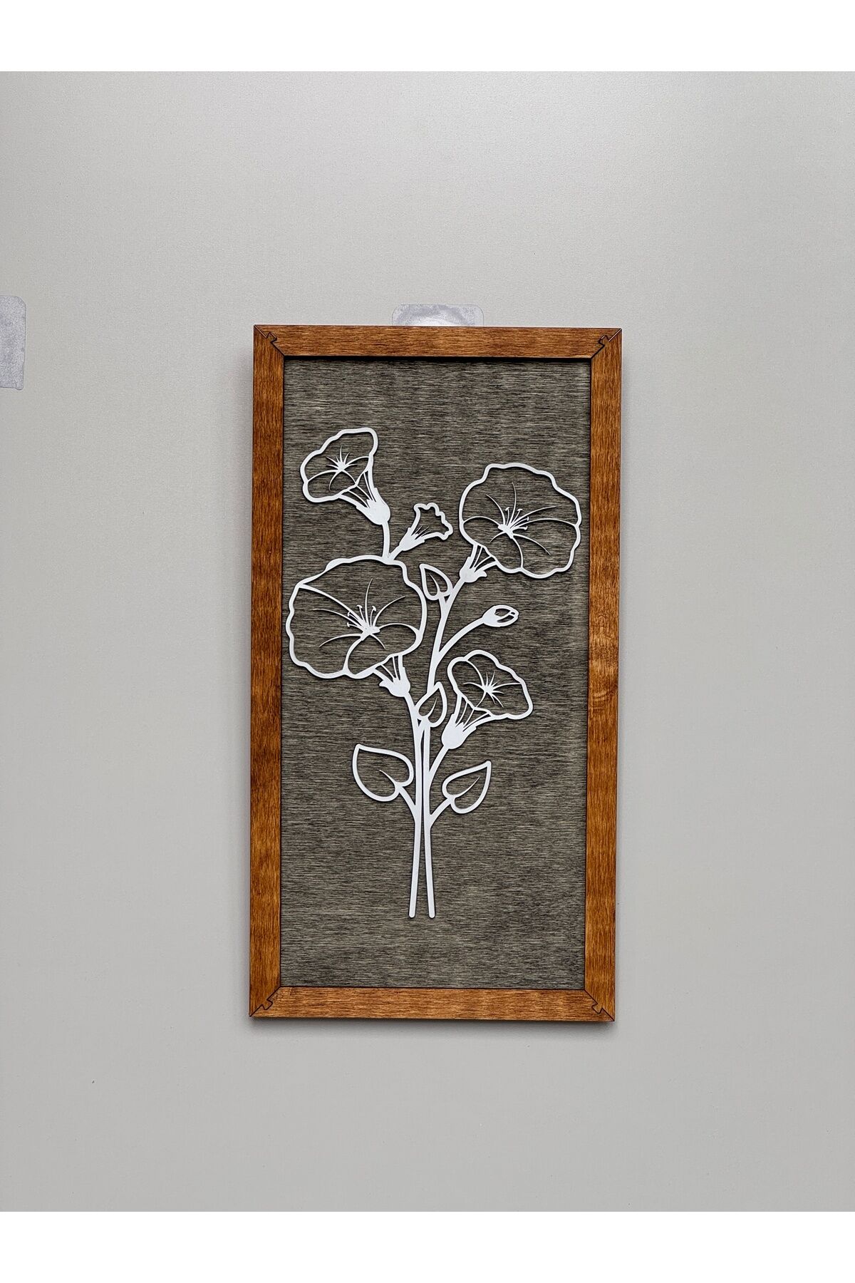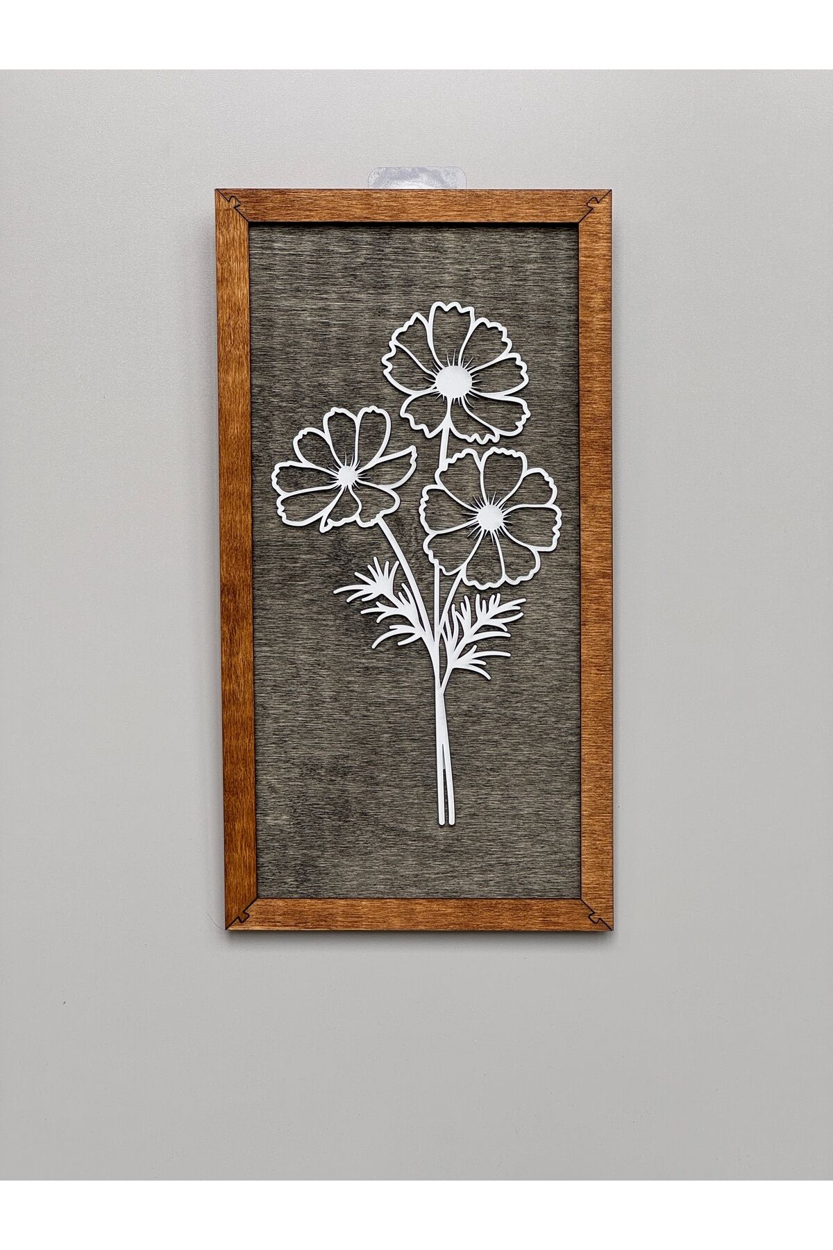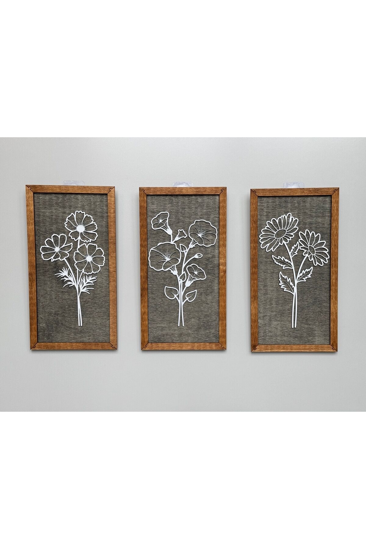 El Boyaması Tik - Gri Renkli Zemin Üzerinde Beyaz Çiçekli 3'lü Tablo Seti