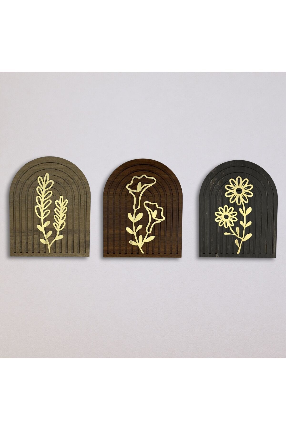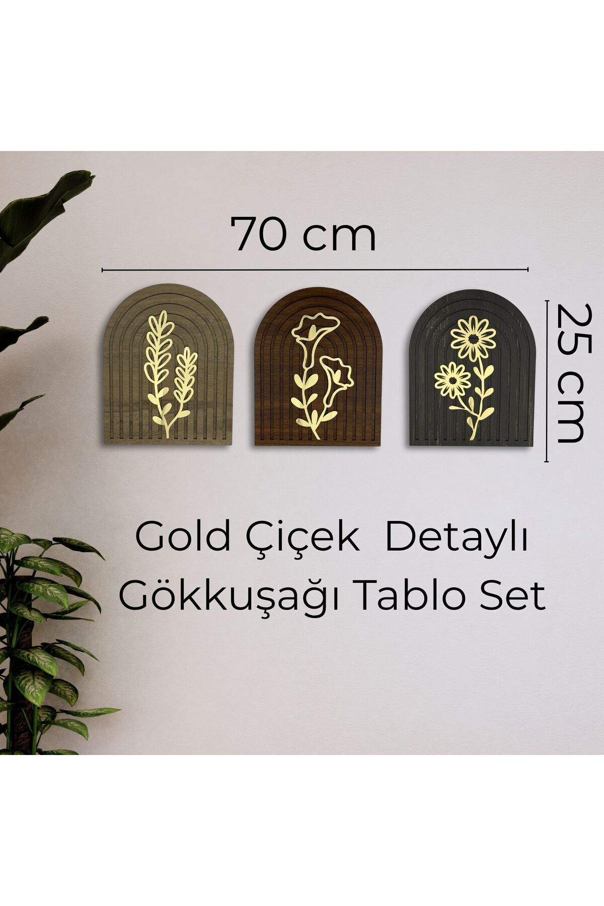 Gold Çiçek Detaylı Ahşap Gökküşağı Duvar Tablo Seti – 70x25 cm Dekoratif Ev Ofis Süsleme