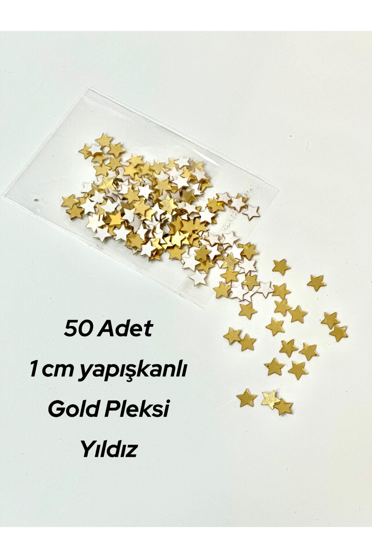 Paket içerisinde 50 adet 1 cm lik yıldız aynalı parlak pleksi yer almaktadır.; arkası yapışkanlıdır