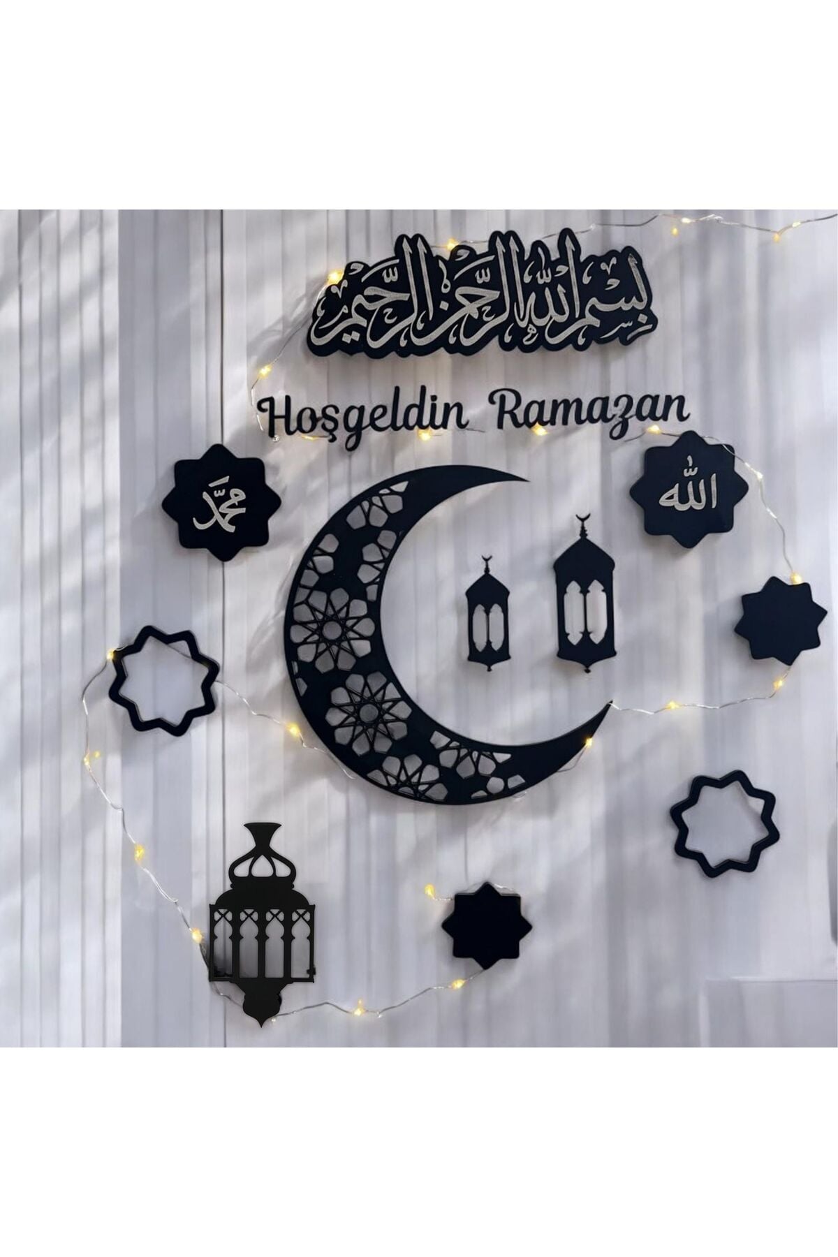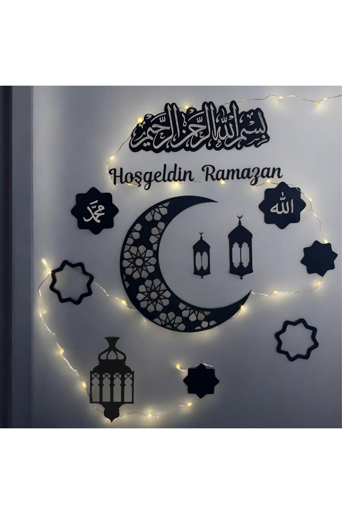 Hoşgeldin Ramazan LED Işıklı Ahşap Duvar Süsü | Ay Yıldız ve Dini Figürlerle Dekorasyon