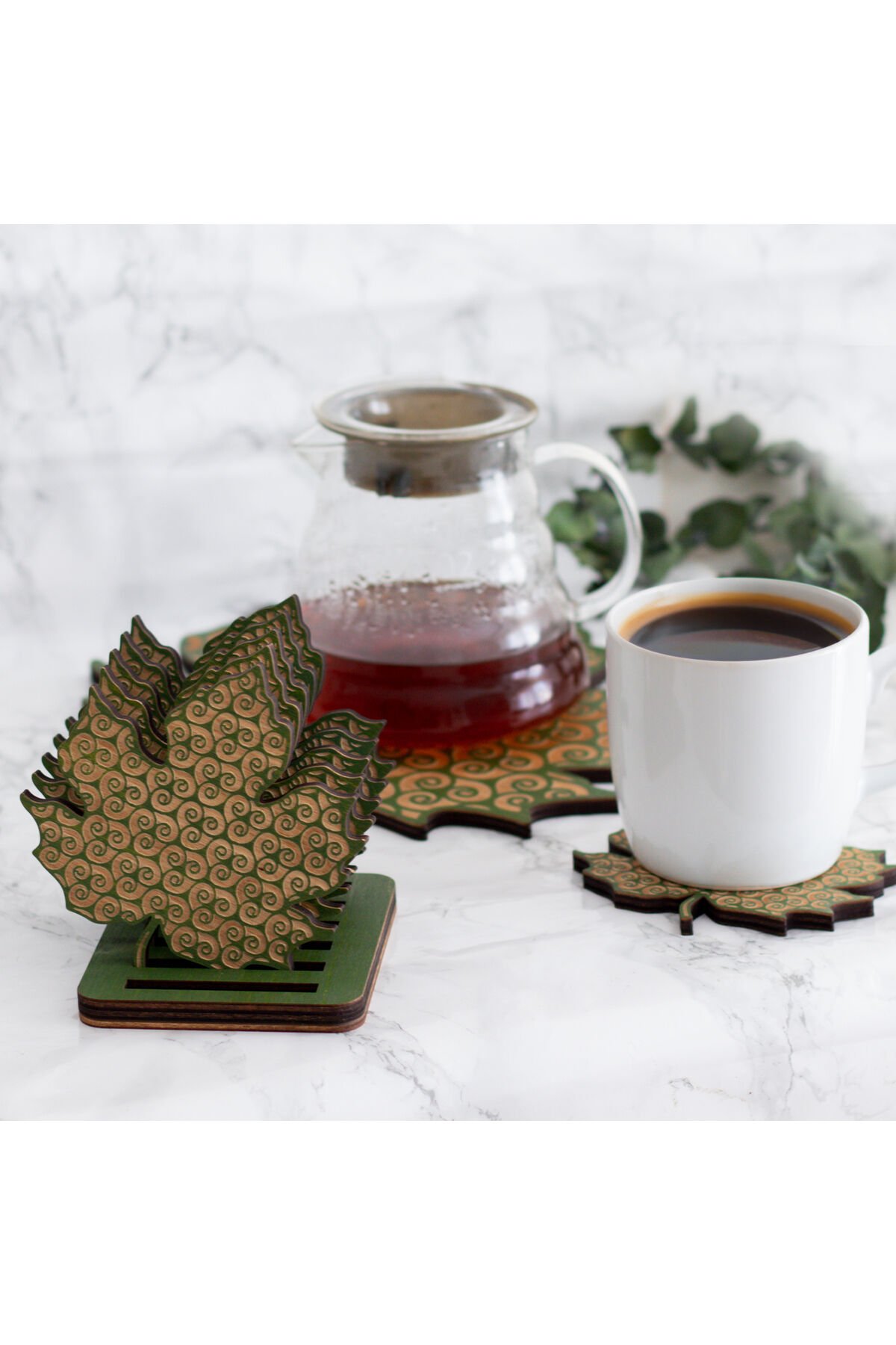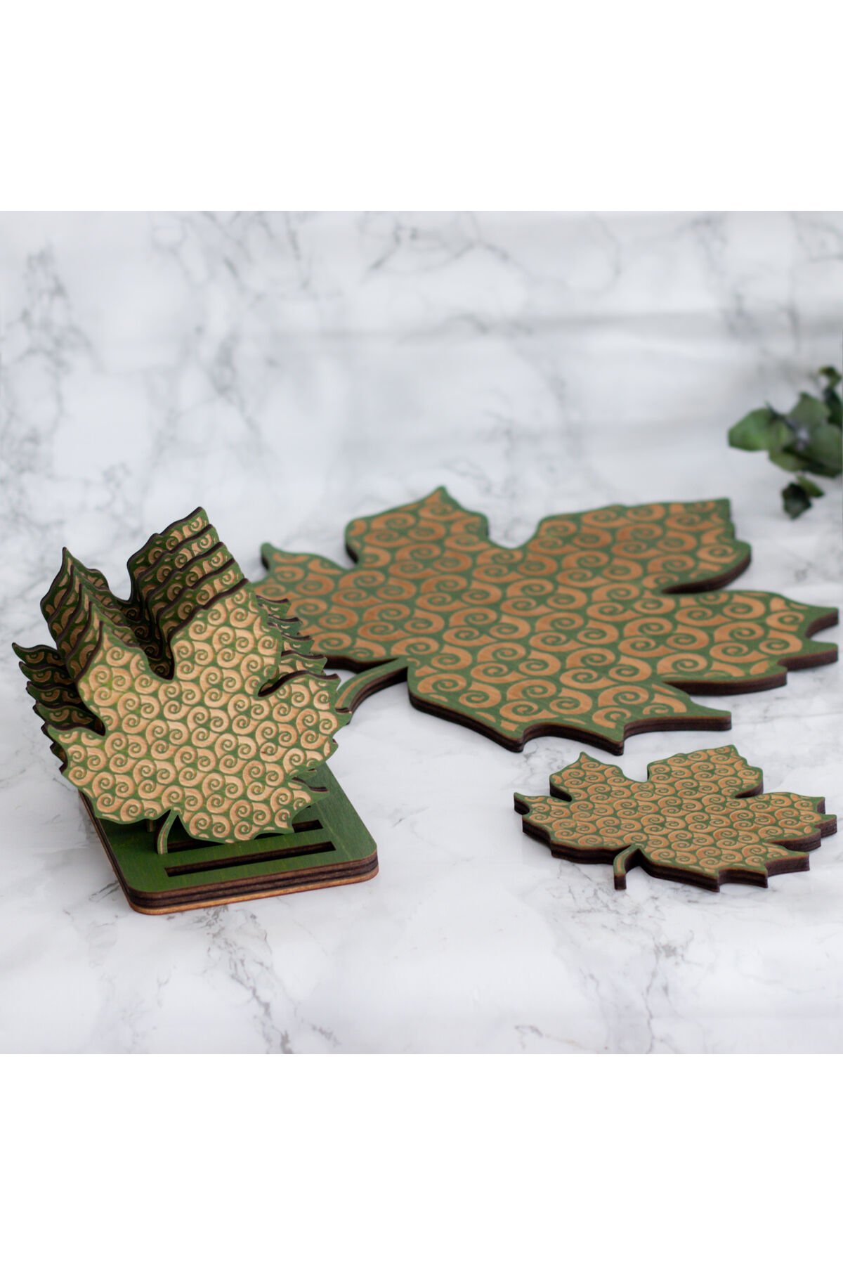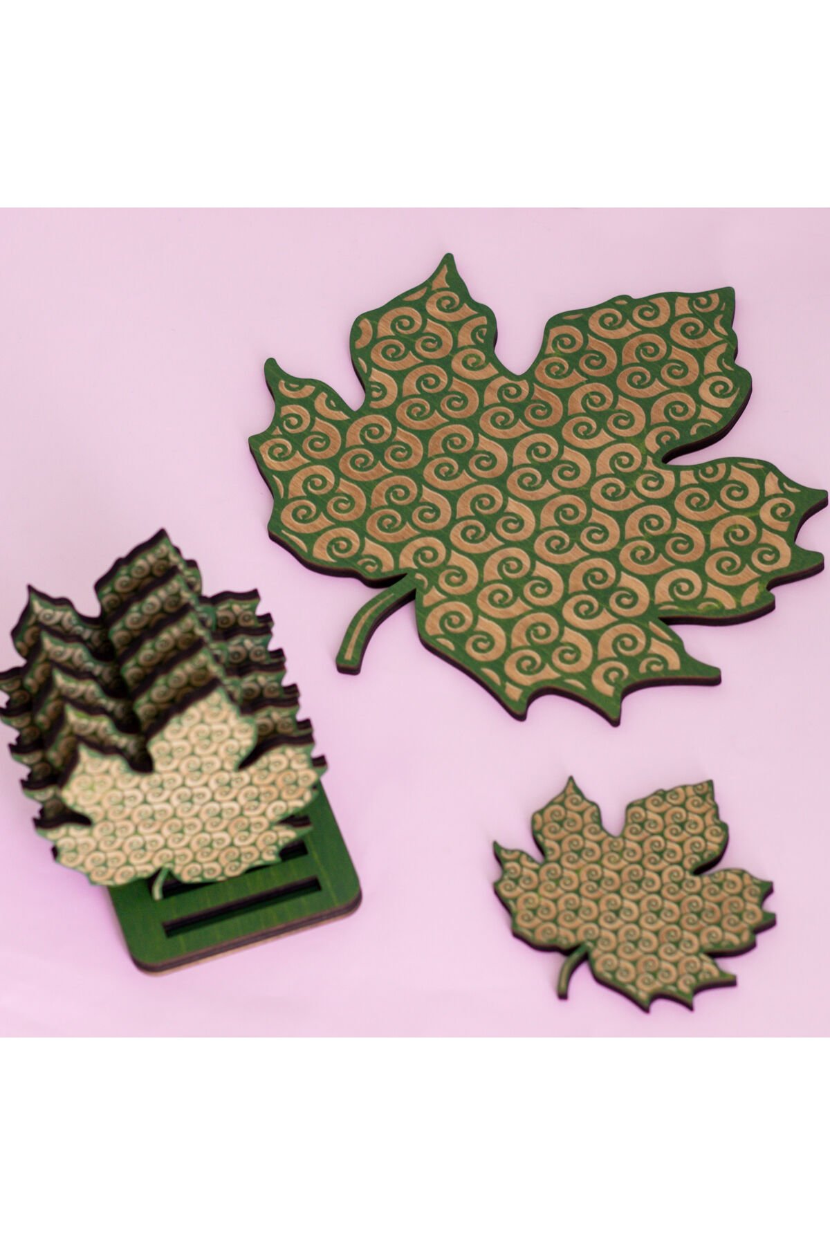 Huş Ahşap Yaprak Desenli Nihale ve 6’lı Bardak Altlığı Servis Seti - Otantik - Nostaljik hdmf00003