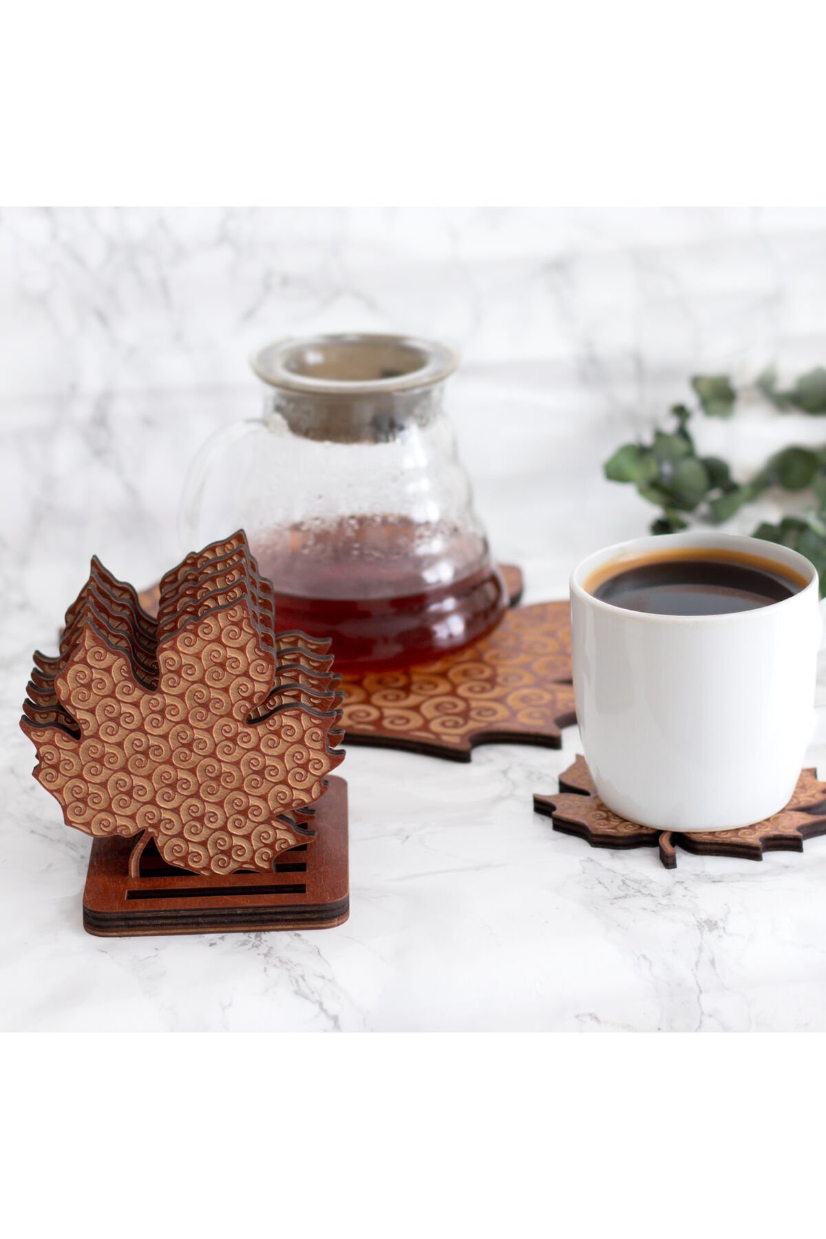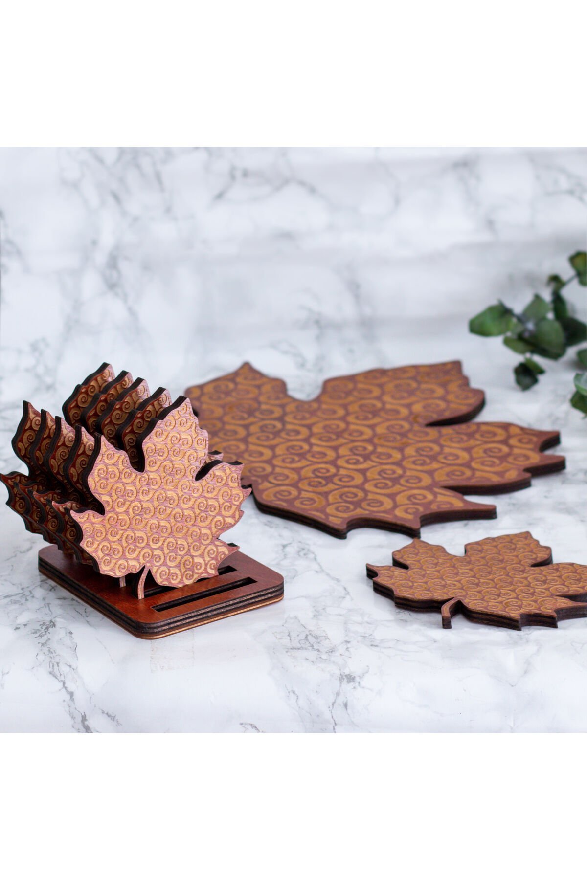 Huş Ahşap Yaprak Desenli Nihale ve 6’lı Bardak Altlığı Seti - Otantik - Nostaljik
