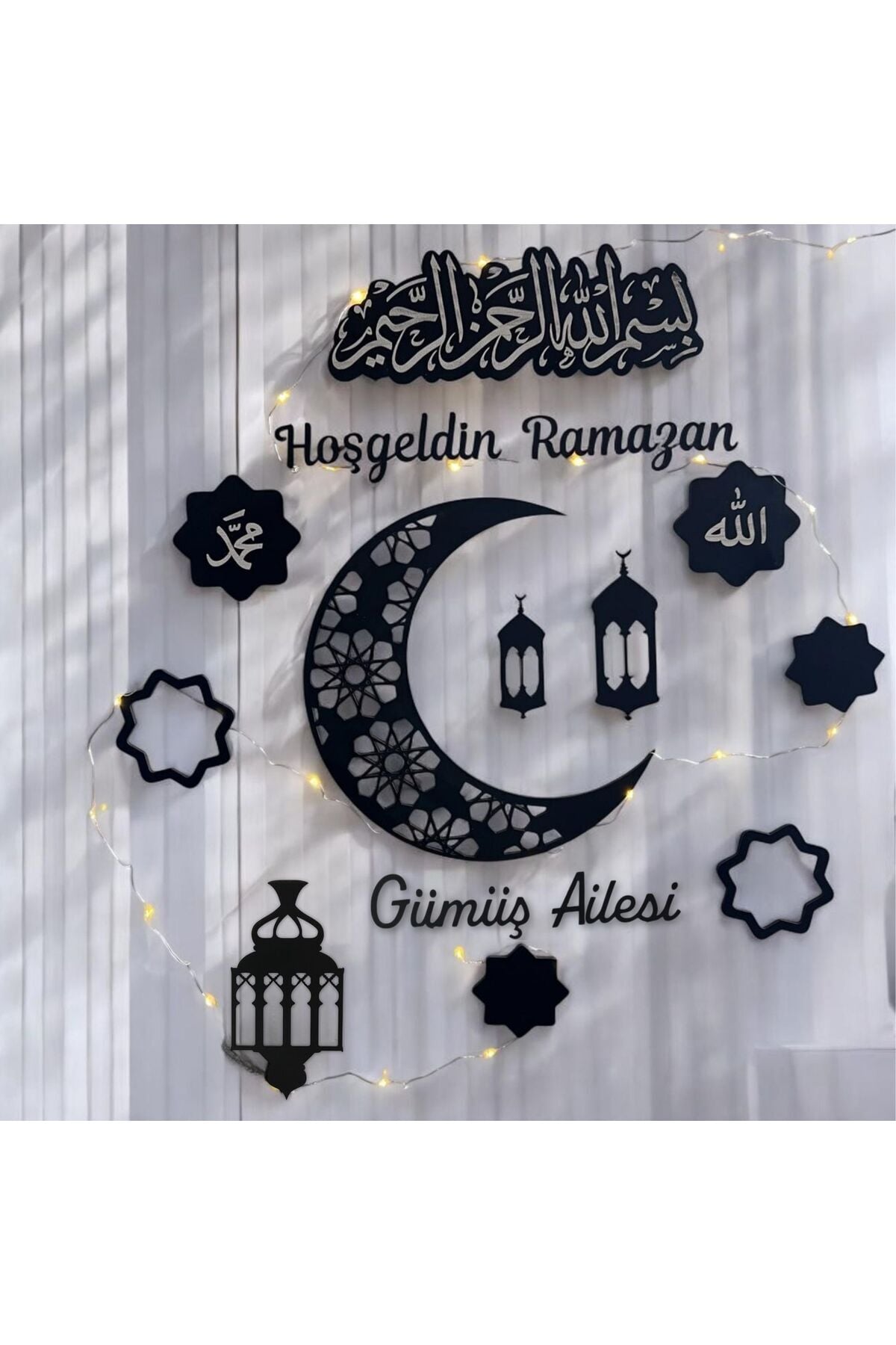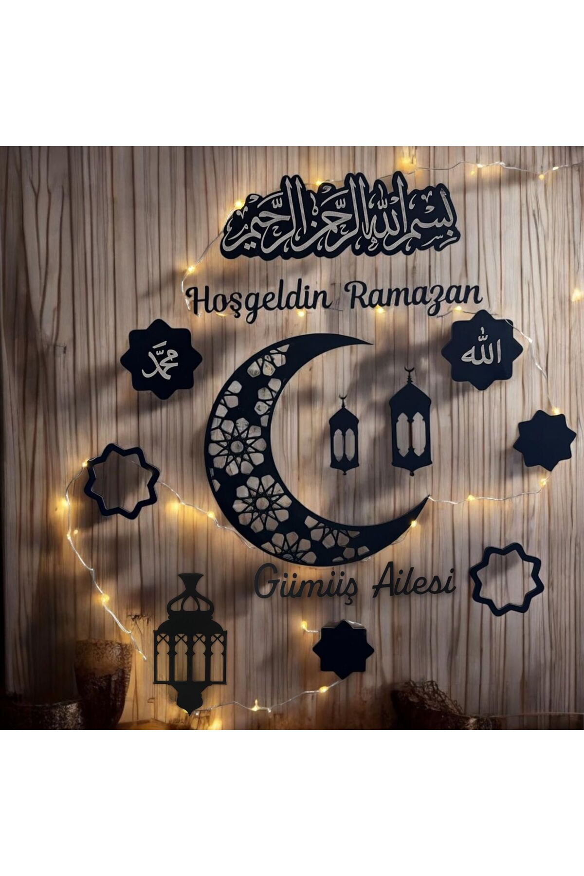 Doğal ahşap malzemeden üretilen bu özel duvar süsü, sıcak tonlu LED ışık detayıyla akşam saatlerinde loş ve dingin bir ortam sağlar. Etrafını saran ışık zinciri sayesinde dekoratif görünüm daha da ön plana çıkar. Salon, oturma odası, antre veya iş yerlerinde Ramazan coşkusunu estetik bir şekilde yansıtmak için idealdir.