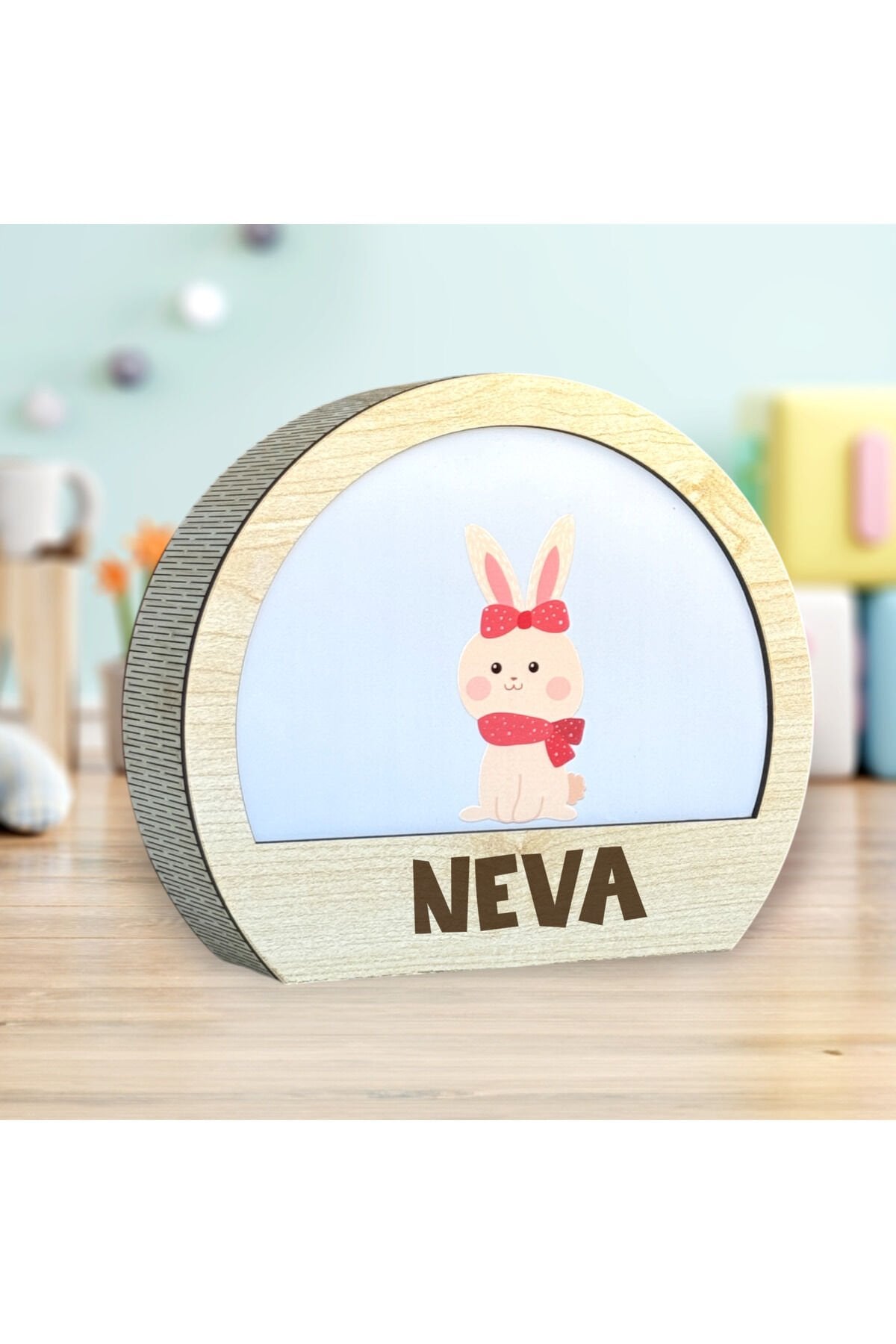 Yüksek kaliteli, pürüzsüz doğal ahşap (MDF) malzemeden üretilmiş, dairesel formda tasarlanmış bir masa üstü LED gece lambasıdır. Merkeze yerleştirilen sevimli, fiyonklu ve atkılı tavşan figürü, ışık yandığında odada huzurlu bir derinlik oluşturur. En belirgin özelliği, alt kısmındaki ahşap alana "NEVA" veya dilediğiniz başka bir ismin lazerle işlenebilmesidir. İsimli gece lambası hem bir aydınlatma aracı hem de isme özel bir dekorasyon parçasıdır.