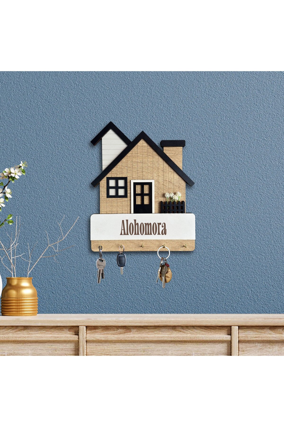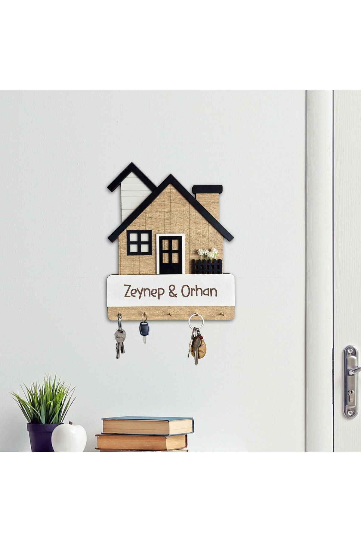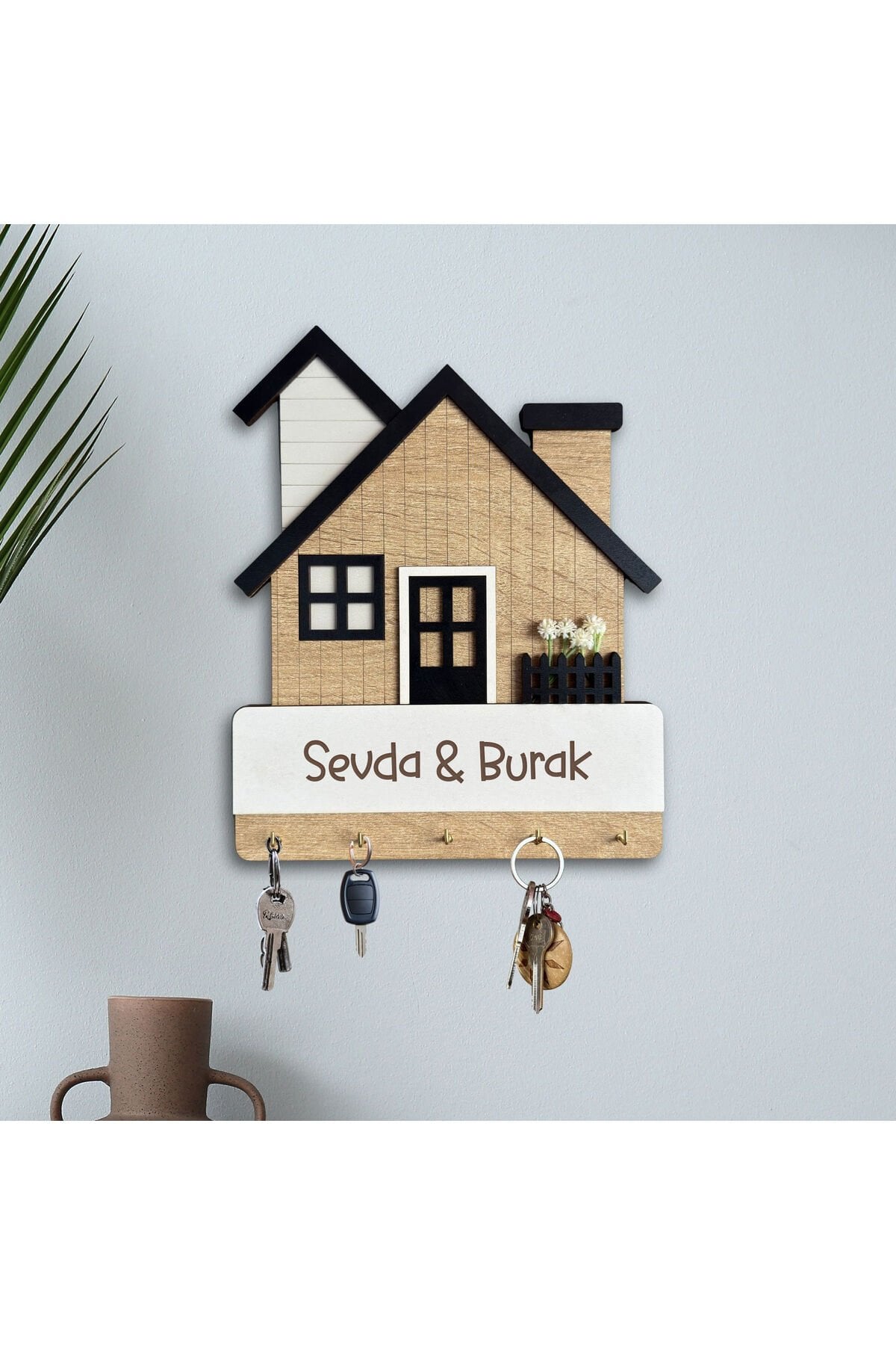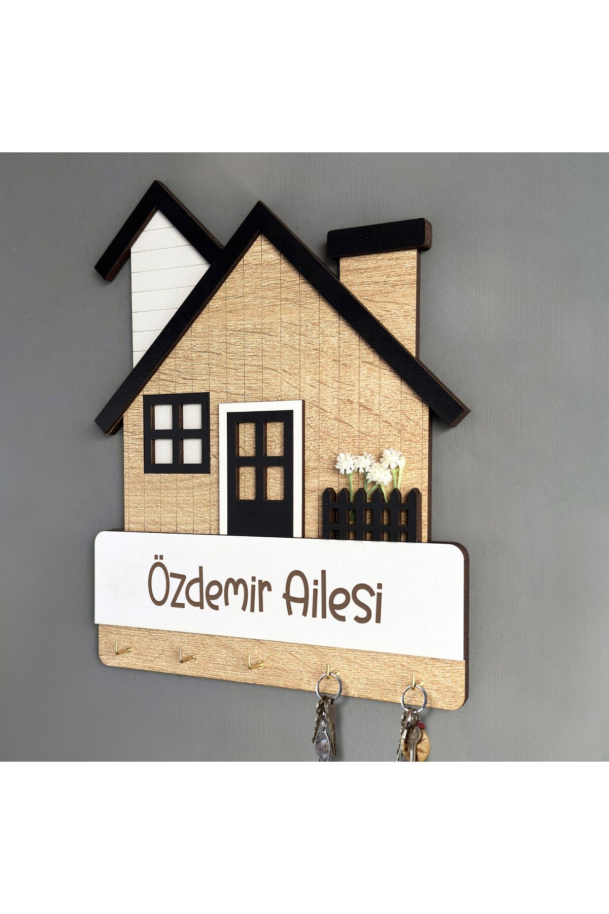 Kişiye Özel Ev Şeklinde Duvar Anahtarlığı – İsim ve Tarih Kazımalı Anahtar Askılığı