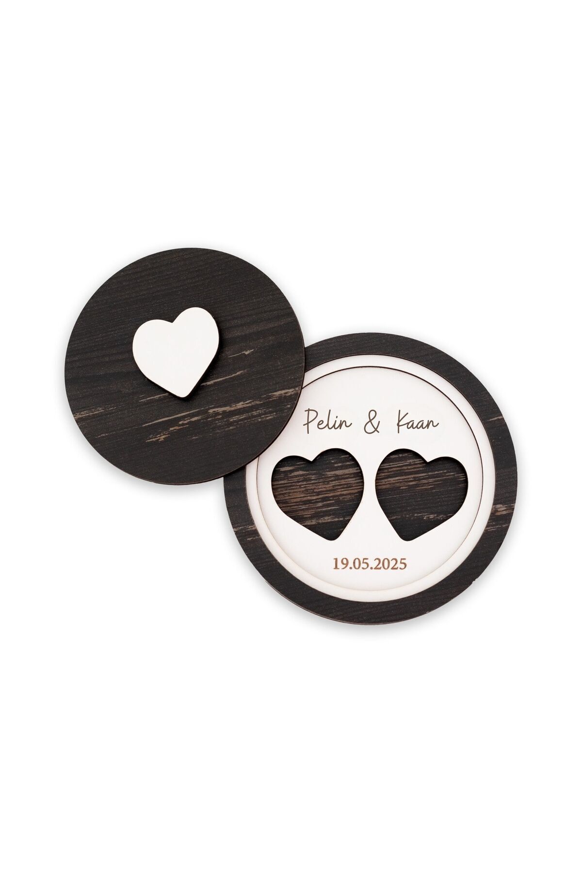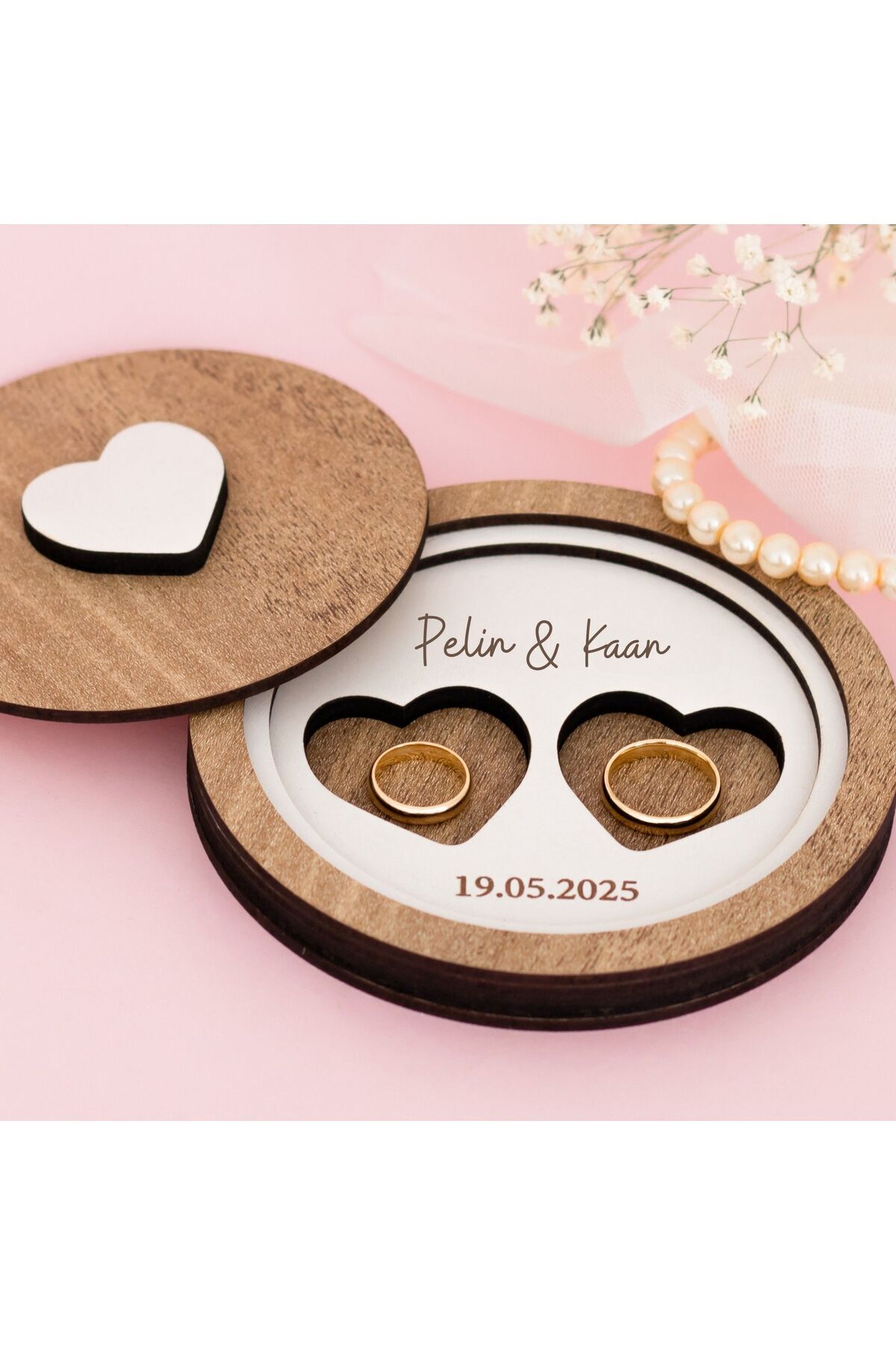 Kişiye Özel İsimli Yuvarlak Yüzük Kutusu Nişan Evlilik Teklifi ve Söz Organizasyon Ahşap Takı Kutusu