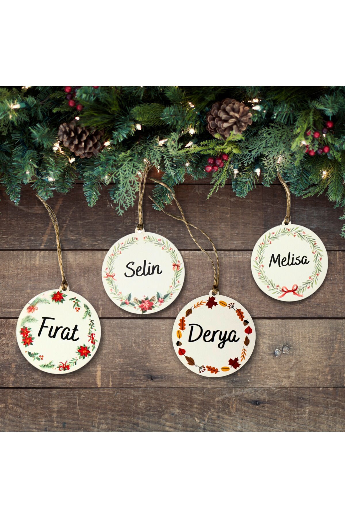 Kişiye Özel MDF 4 lü set Yılbaşı Ağaç Süsü – İsimli Dekoratif Yuvarlak Süs 9 cm