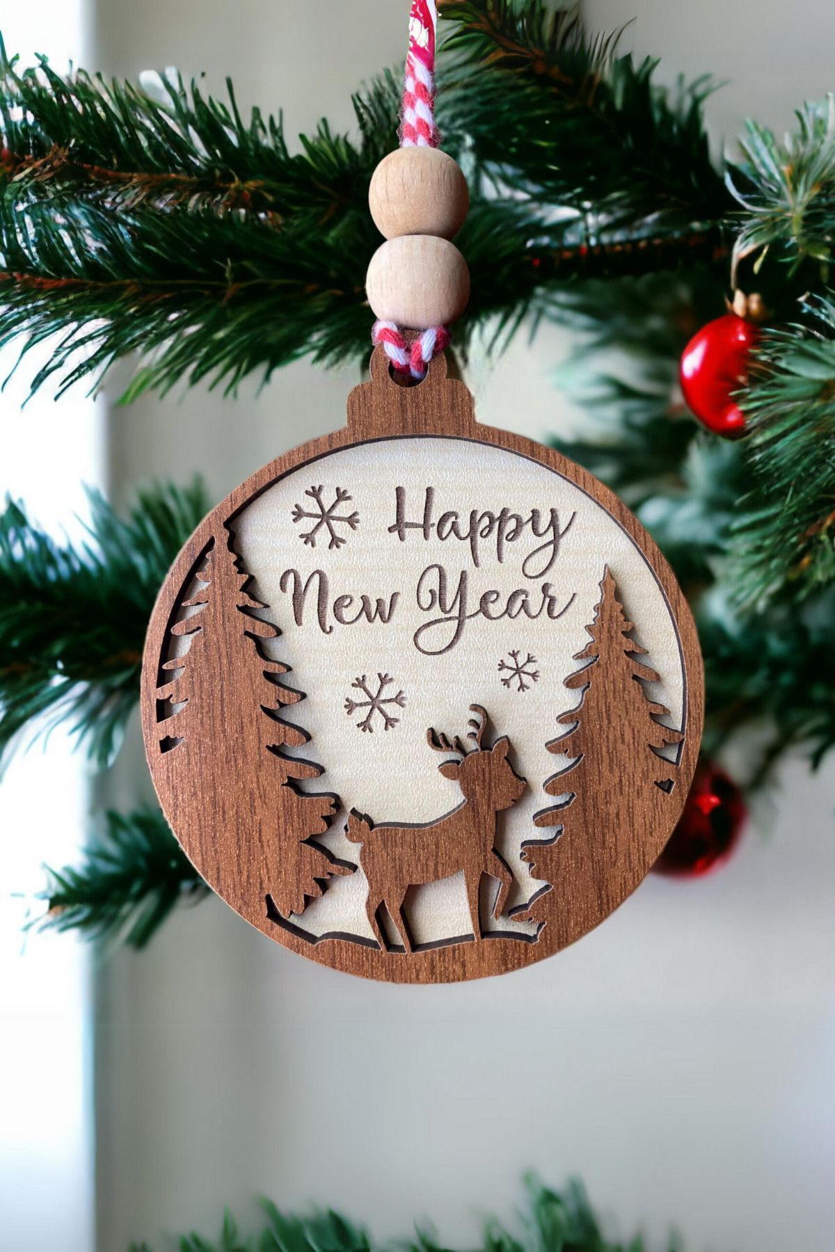 Sevimli Geyik İşlemeli İskandinav Tarzı İki Çam Ağacı Happy New Year Yazılı Dekoratif Yılbaşı Süsü