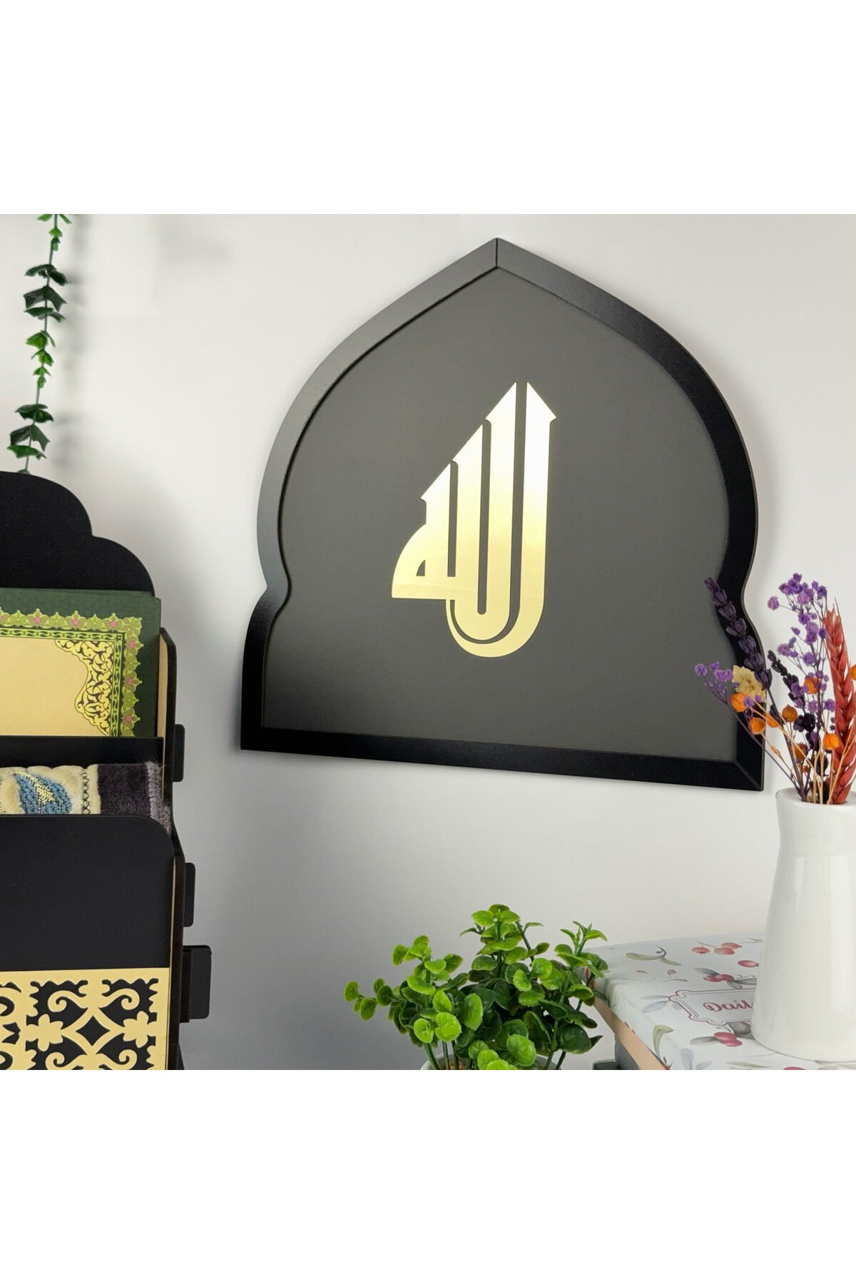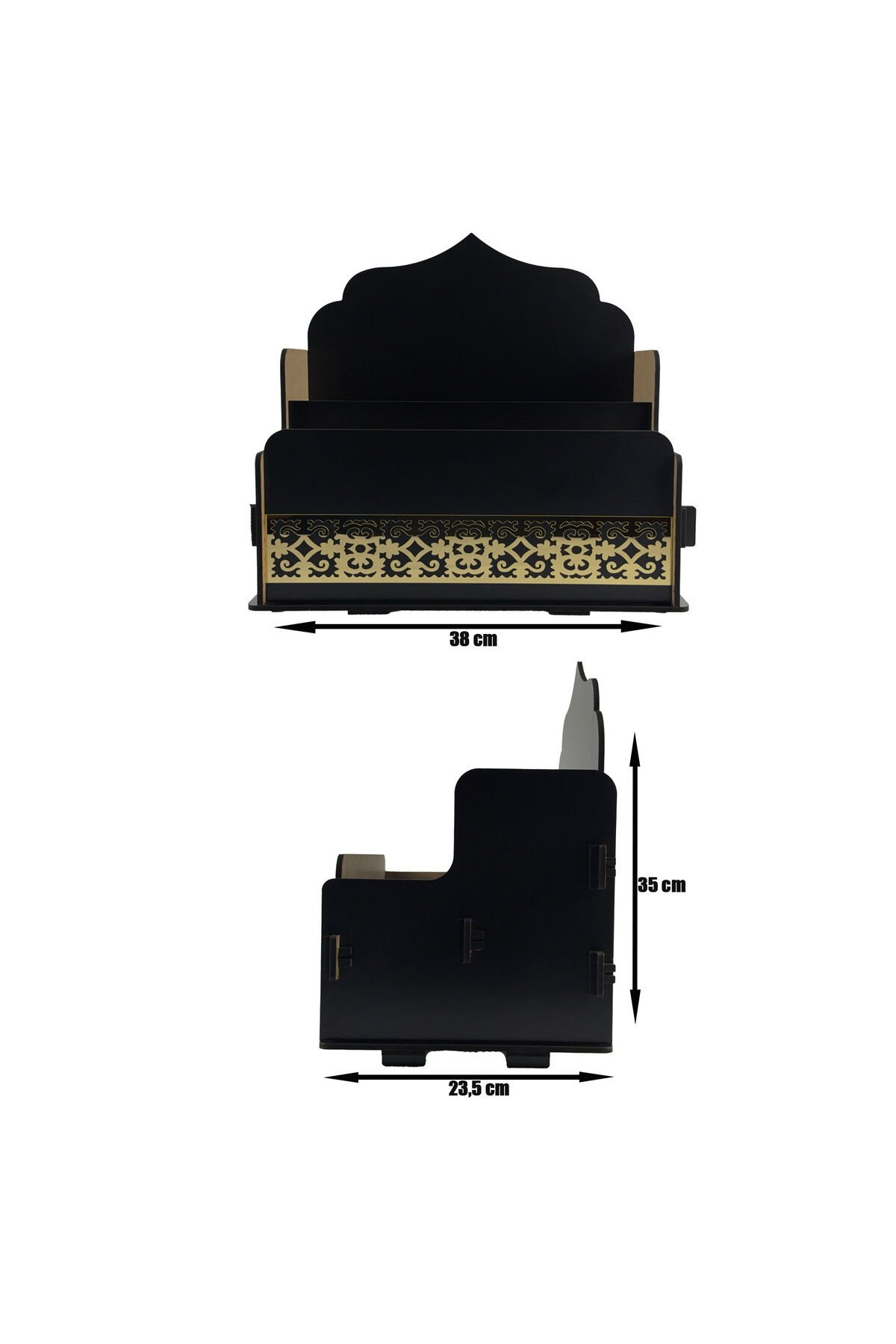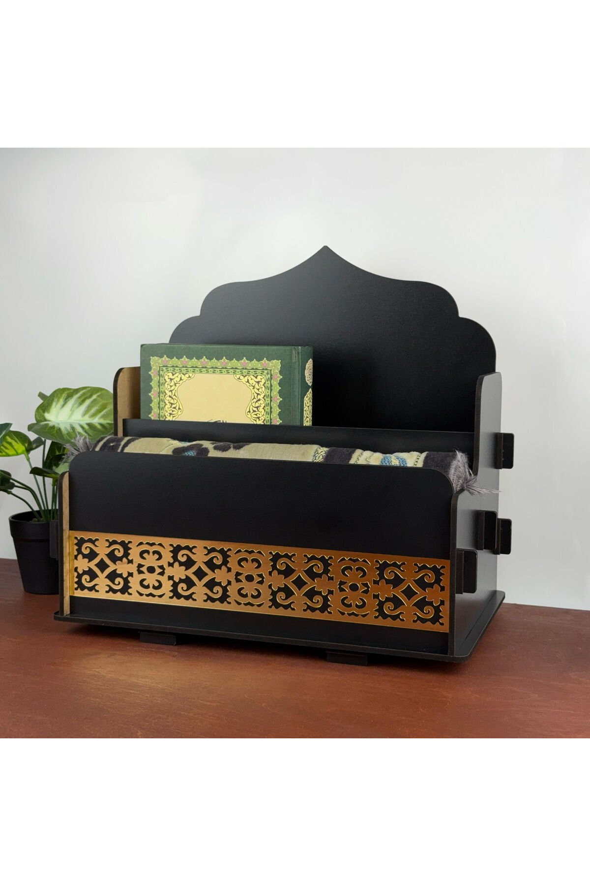 Siyah Ahşap Gold Pleksi Süslemeli Seccadelik ve Kuran Düzenleyici, Şık İslami Dekoratif