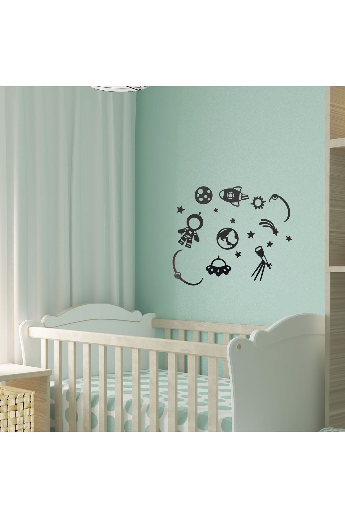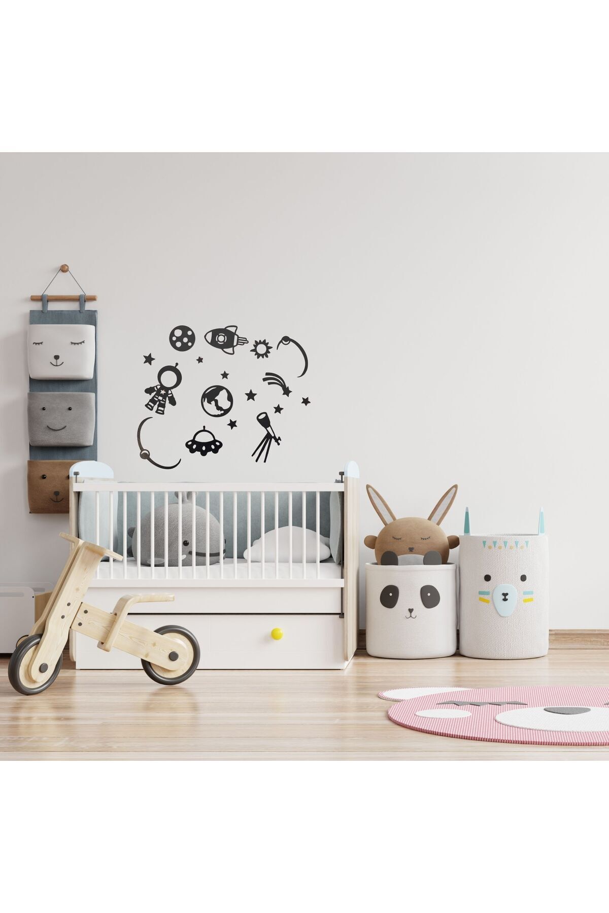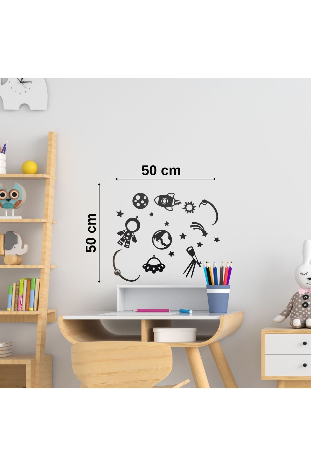 Uzay Temalı Siyah Ahşap Duvar Süsü – Çocuk Odası Dekoru | 50x50 cm | Kendinden Yapışkanlı